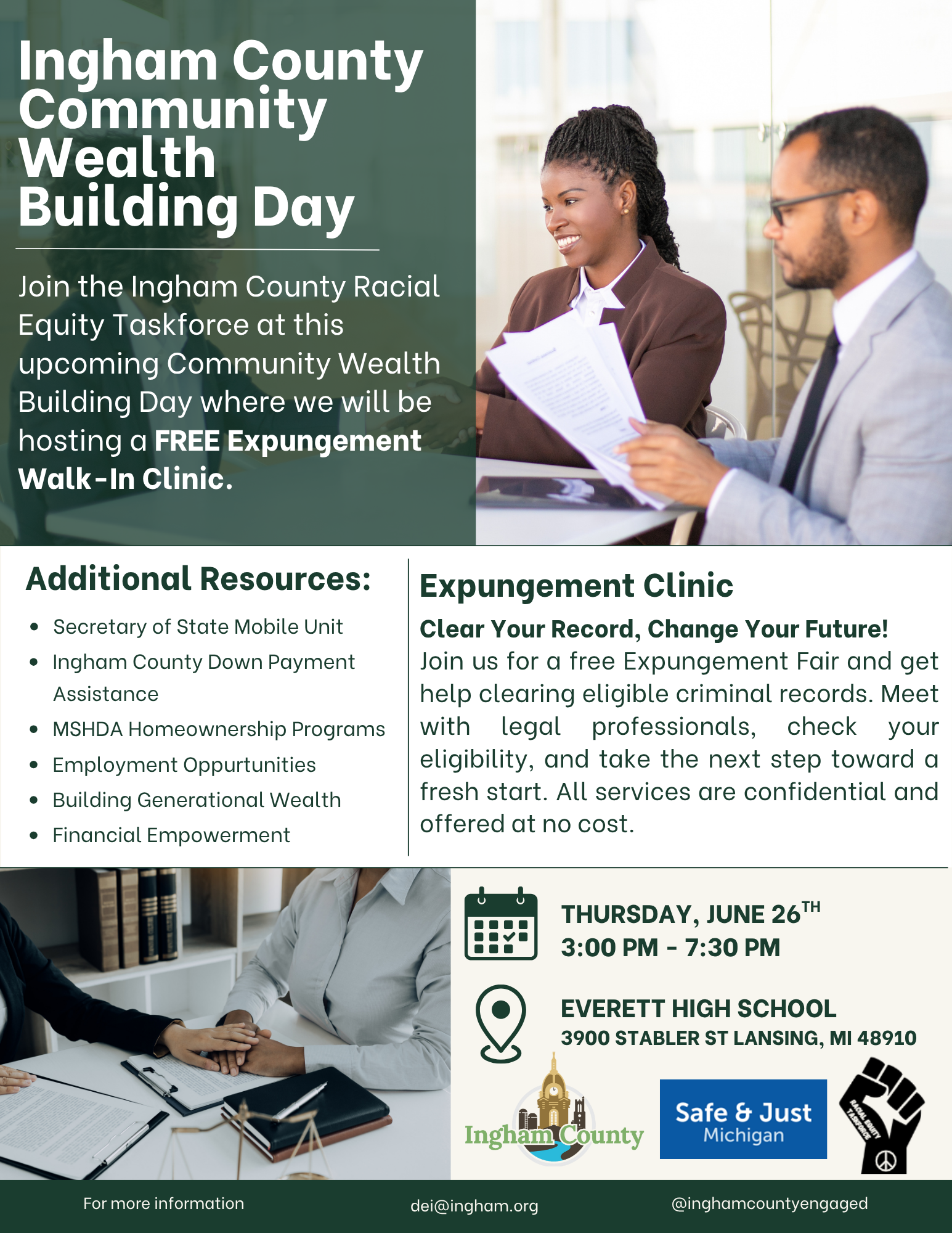 Come out for Ingham County Community Wealth Building Day on Thursday, June 26th! They are hosting a FREE Expungement Walk-In Clinic to help clear eligible criminal records and support fresh starts. PLUS, connect with resources on: