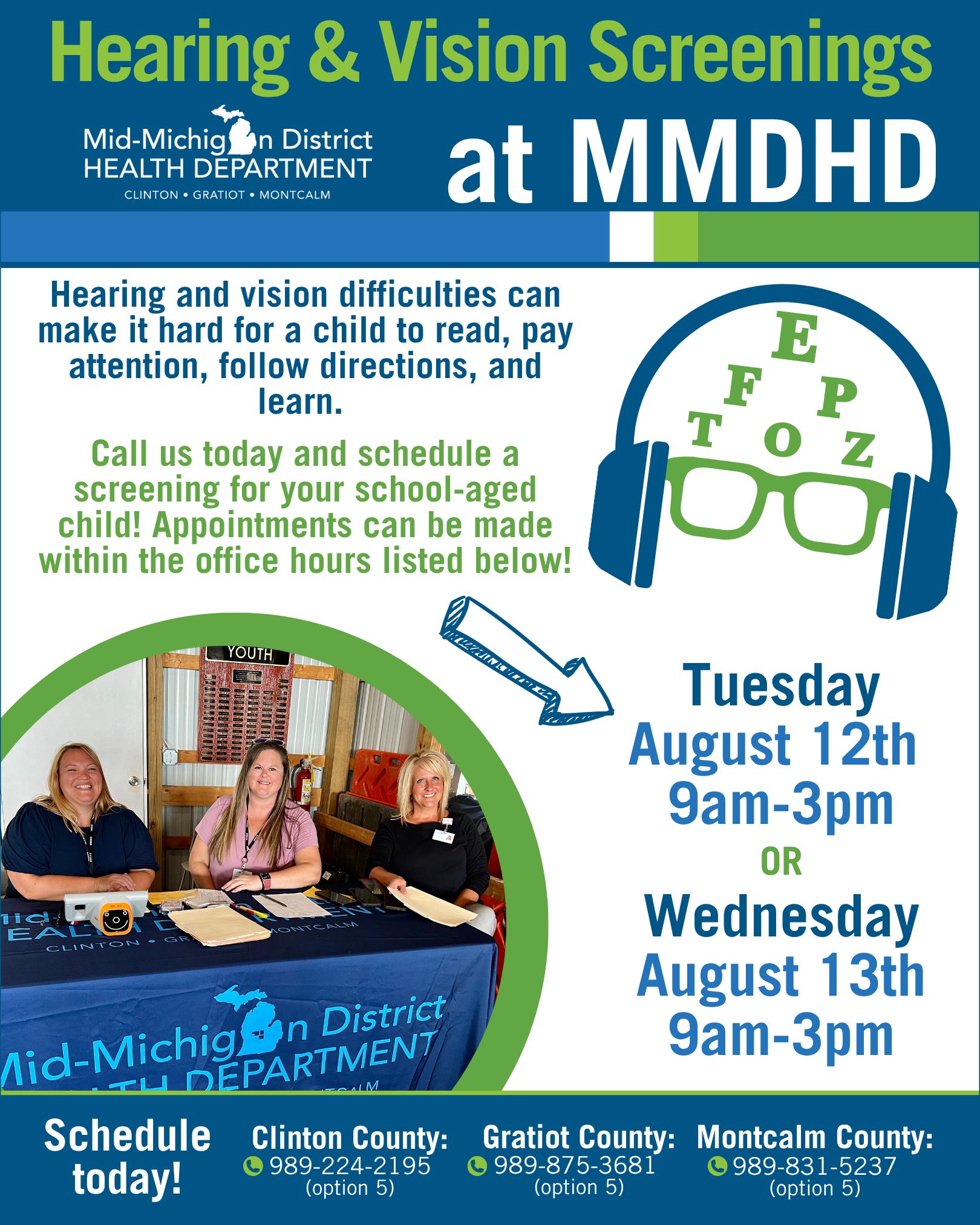 Hearing and vision difficulties can make it hard for a child to read, pay attention, follow directions, and learn. Call your local Mid-Michigan District Health Department branch today to schedule a screening for your school-aged child on Tuesday, August 12 (9am-3pm) or Wednesday, August 13 (9am-3pm).