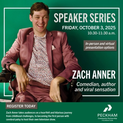 Join us on Friday, October 3 for Peckham’s Fall Speaker Series featuring Zach Anner—comedian, author, and award-winning speaker. In this heartfelt and hilarious morning session, Zach takes us on a journey from childhood challenges to winning a travel show from Oprah. With humor and honesty, he celebrates the people who turn uphill battles into joyful adventures, challenges the myth of being “self-made,” and redefines success through community, empathy, and authenticity. Open to the public—bring your friends, family, and community partners! There will be an interactive Q&A session after the speech. FREE.
