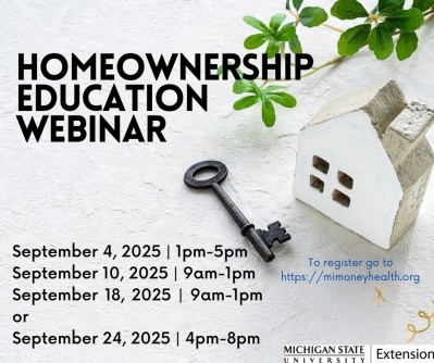 This homeownership seminar from MSU Extension will provide you with valuable information about the home-buying process. Webinar dates are September 4, 10, 18 and 24. Times will vary. Go to https://www.canr.msu.edu/events/homeownership-sept24 to register. Cost: $25 per household. To request a scholarship based on financial need, contact the instructor below with your county of residence, household size and gross annual income to see if you meet the criteria.