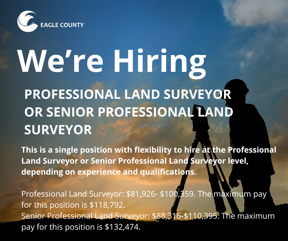 Eagle County Government’s Engineering Department is seeking an experienced and motivated Professional Land Surveyor to join our team. This is a single position with the flexibility to hire at either the Professional Land Surveyor or Senior Professional Land Surveyor level, depending on the candidate\\\'s experience and qualifications.