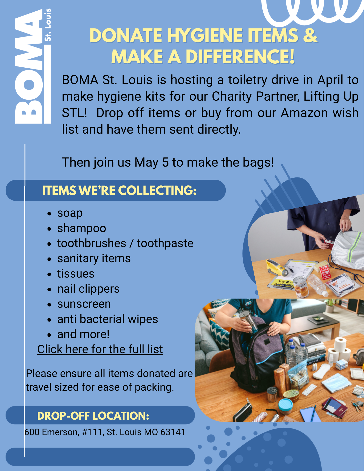 BOMA St. Louis is hosting a toiletry drive in April to make hygiene kits for our Charity Partner, Lifting Up STL! Drop off items or buy from our Amazon wish list and have them sent directly. Then join us May 5 to make the bags!