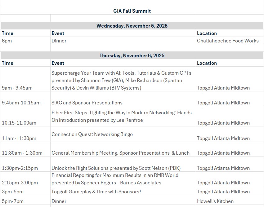 Get ready for our GIA Fall Summit packed with connection, education, and unforgettable experiences! Whether you're looking to sharpen your technical skills, explore emerging technologies, or strengthen your network across Georgia’s electronic security industry, this event delivers it all.