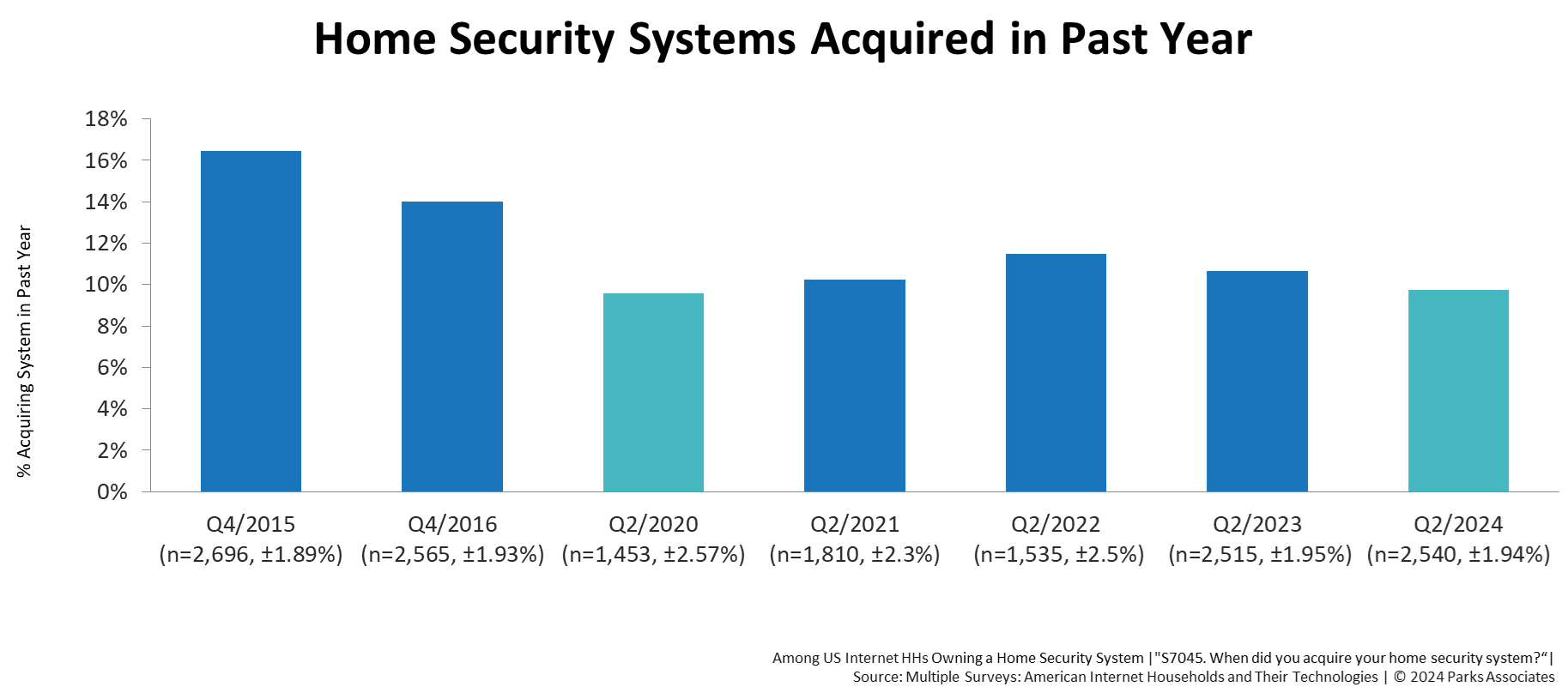 "According to Parks Associates latest research security system adoption has stabilized at roughly 31-32% of US internet households owning a security system after a spike in purchasing safety, security, and technology products during the pandemic. Economic headwinds continue. Though inflation has come down, overall pricing of goods and services are still higher than several years ago, restraining consumer purchasing power. Mortgage interest rates have also come down slightly, but housing prices remain high and inventory is limited, restraining home sales. Residential security system providers must prove their value to attract customers to buy into the fuller capabilities of a system and to retain customers eyeing cheaper options."