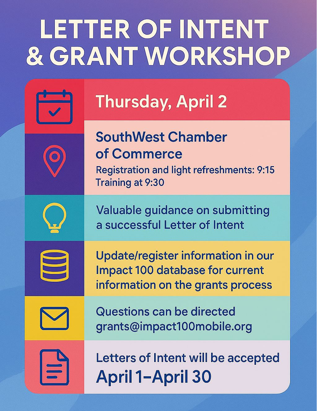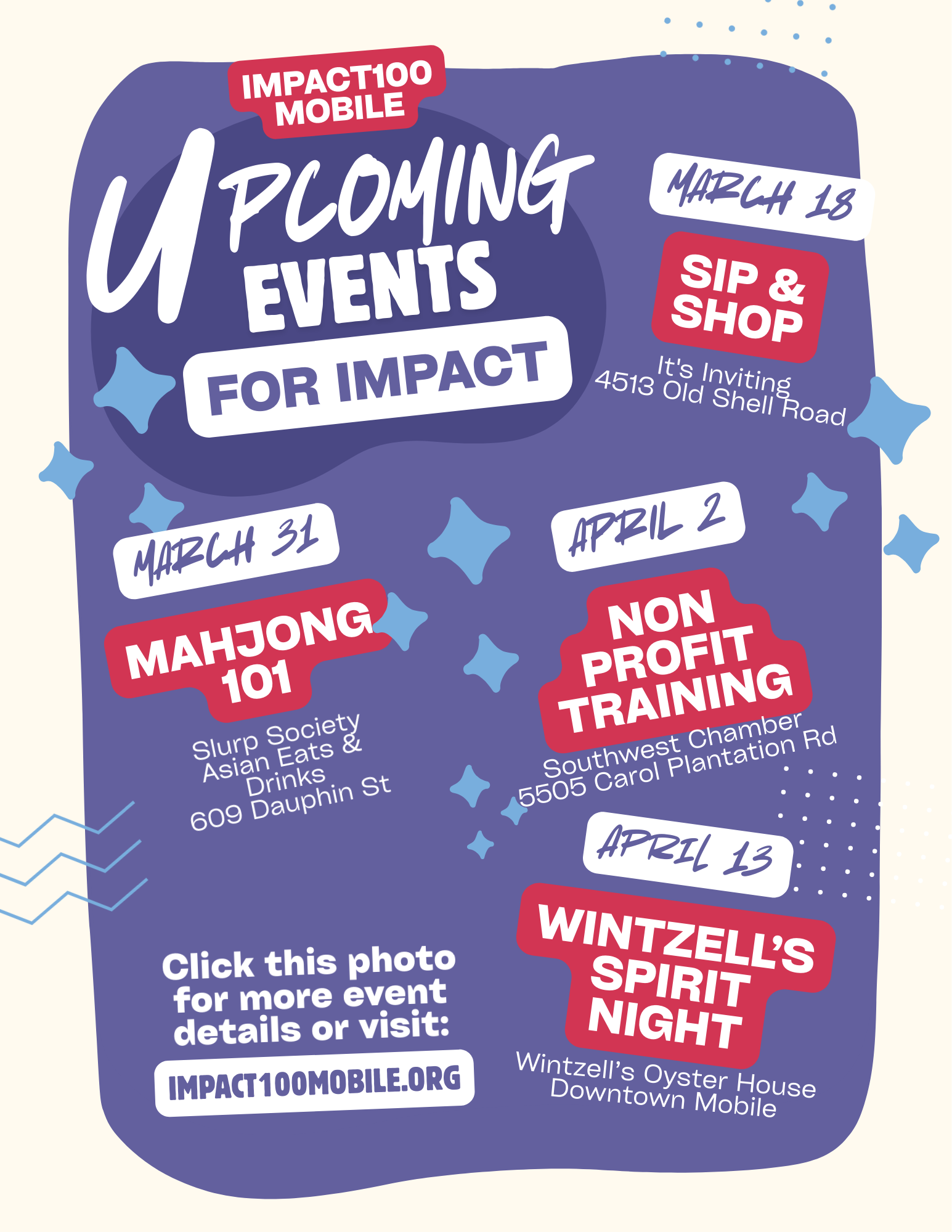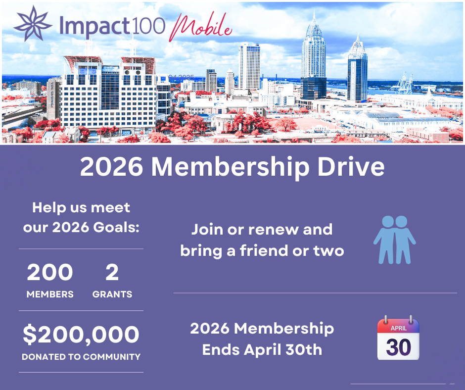 The deadline to join or renew your membership for the 2026 grant cycle is April 30, 2026. We are deeply thankful for your unwavering support and commitment to Impact100 Mobile. Please introduce us to your friends and help us grow to 200 members!