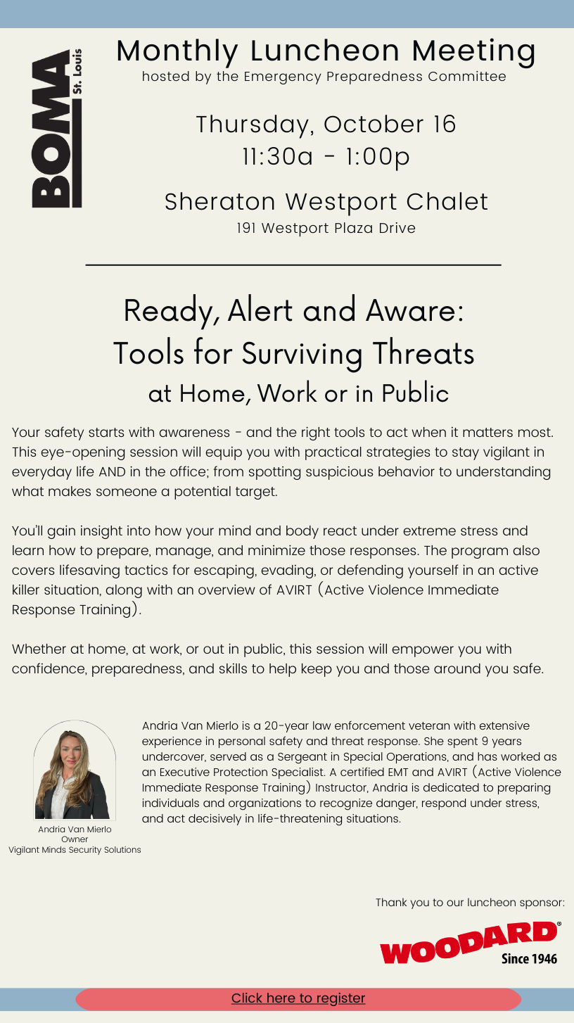 Your safety starts with awareness - and the right tools to act when it matters most. This eye-opening session will equip you with practical strategies to stay vigilant in everyday life AND in the office; from spotting suspicious behavior to understanding what makes someone a potential target. Join BOMA for its October Luncheon, hosted by the Emergency Preparedness Committee.