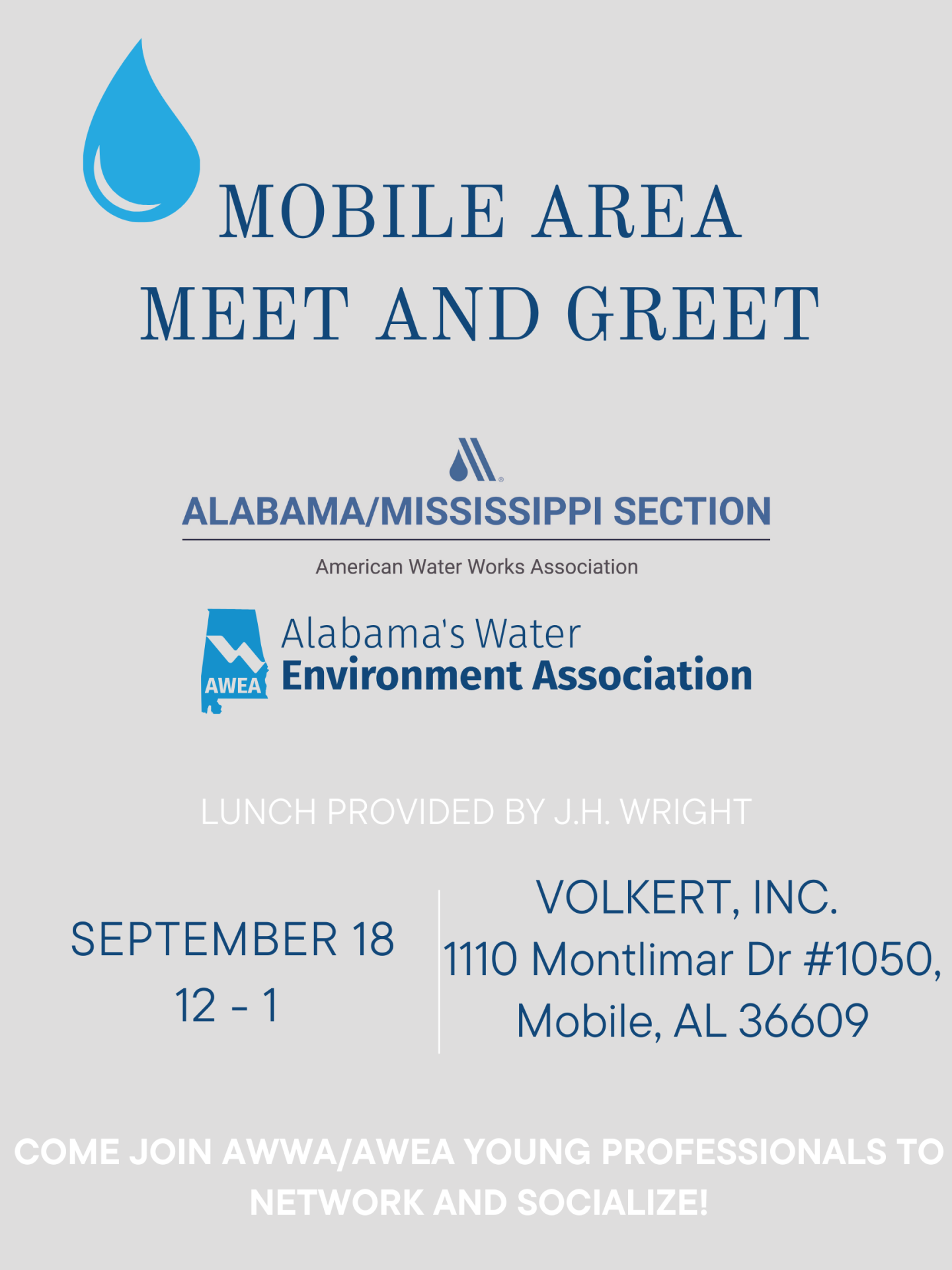 We're excited to have an event planned next month for all those in the Mobile area to get to know each other. We encourage y'all to bring your friends who aren't yet involved to learn more about AWEA/WEF and AWWA.