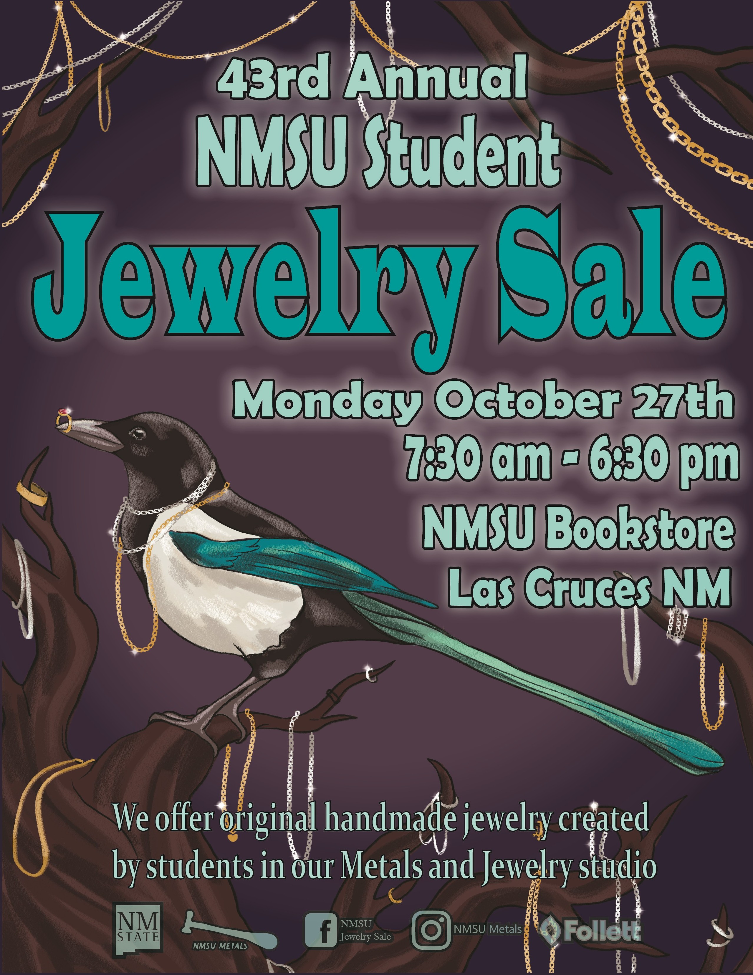 This fundraising event will support workshops, field trip activities for students, studio tools and equipment, and visiting lecturers. The press release and poster are attached. Please include our NMSU Jewelry Sale in your calendar.