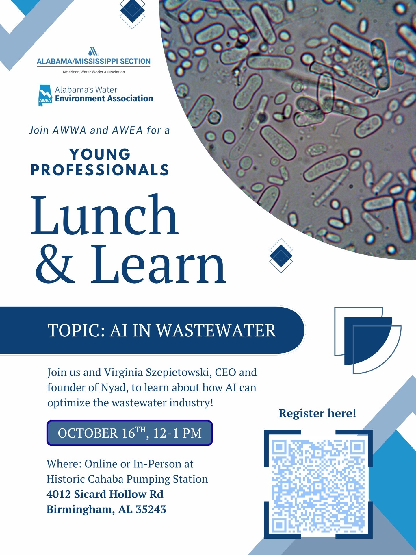 Description: Join us and Virginia Szepietowski, CEO and founder of Nyad, to learn about how AI can optimize the wastewater industry! Date & Time: October 16th from 12PM-1PM Location: The Historic Cahaba Pumping Station Museum
