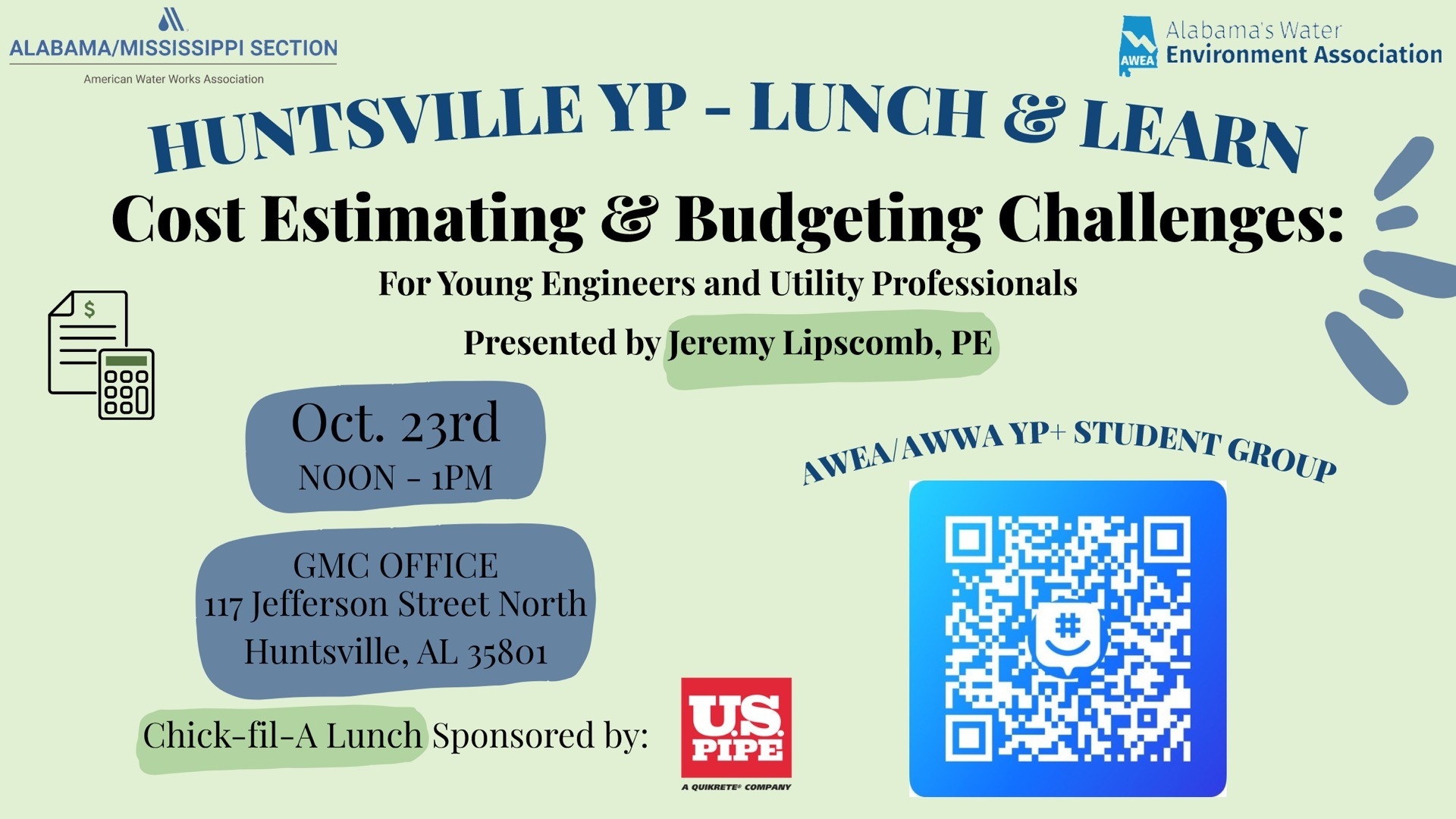 Huntsville Lunch & Learn: Cost Estimating & Budgeting Challenges for Young Engineers and Utility Professionals Description: Join us and Jeremy Lipscomb to learn how to stretch every dollar and sharpen budgeting and cost estimating skills for successful projects Date & Time: October 23rd from 12PM-1PM Location: