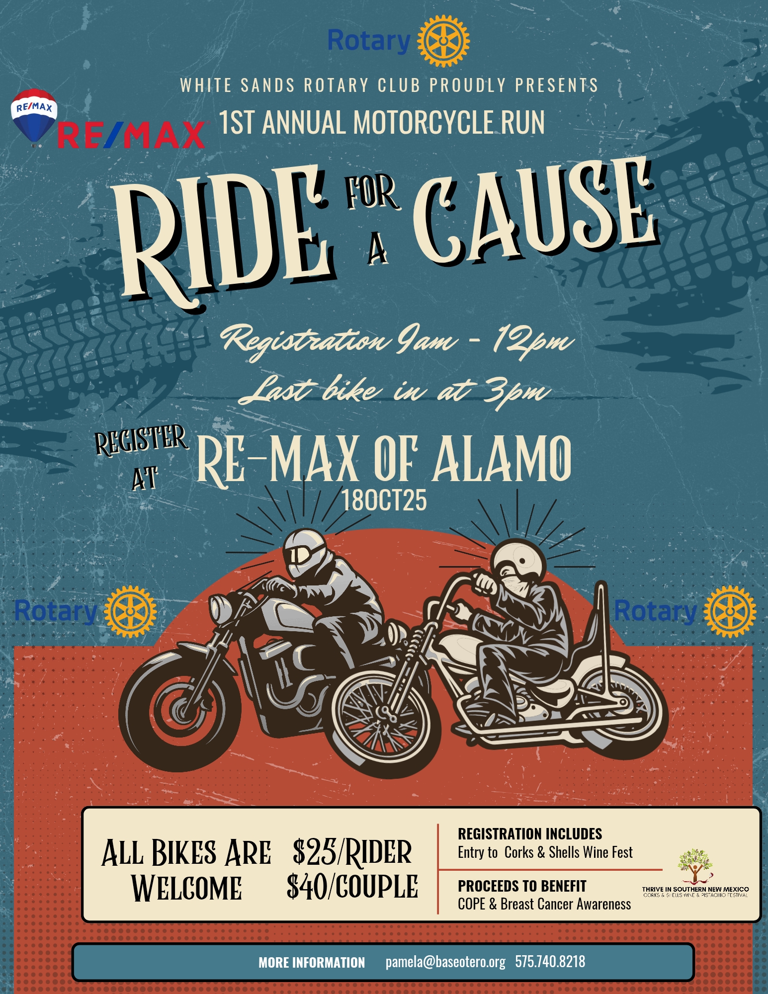 Join us on Saturday, October 18th, for the inaugural White Sands Rotary Ride for a Cause Motorcycle Run benefiting C.O.P.E. and Breast Cancer Awareness. Registration begins at 9 am at REMAX of Alamogordo, 3410 N. White Sands Blvd, Alamogordo, NM. $25 per rider, $40 per couple. Your registration includes admission into Thrive's Corks & Shells Wine & Pistachio Festival, being held at Alameda Park, 1523 N. White Sands Blvd, from 11 am to 6 pm! Need more registration information, want to donate or volunteer, contact Pamela at 575-740-8218 or email pamela@baseotero.org.