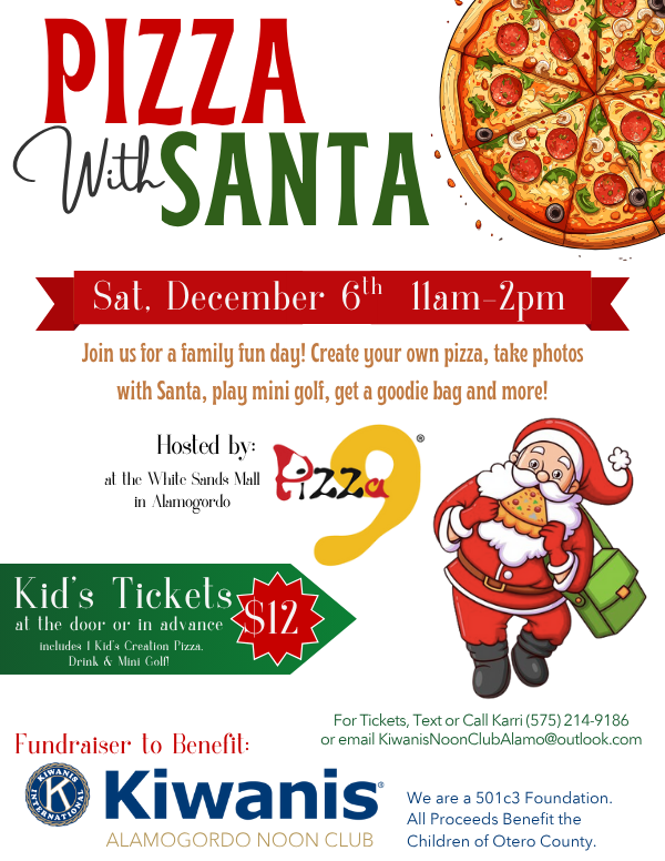 Each children's ticket includes a Kids Creation Pizza, drink and mini golf. Santa will be there for FREE photos, and kids get a goodie bag while supplies last! Tickets available in advance or at the door. Contact Karri Matthews for more information (575) 214-9186 or email KiwanisNoonClubAlamo@Outlook.com.