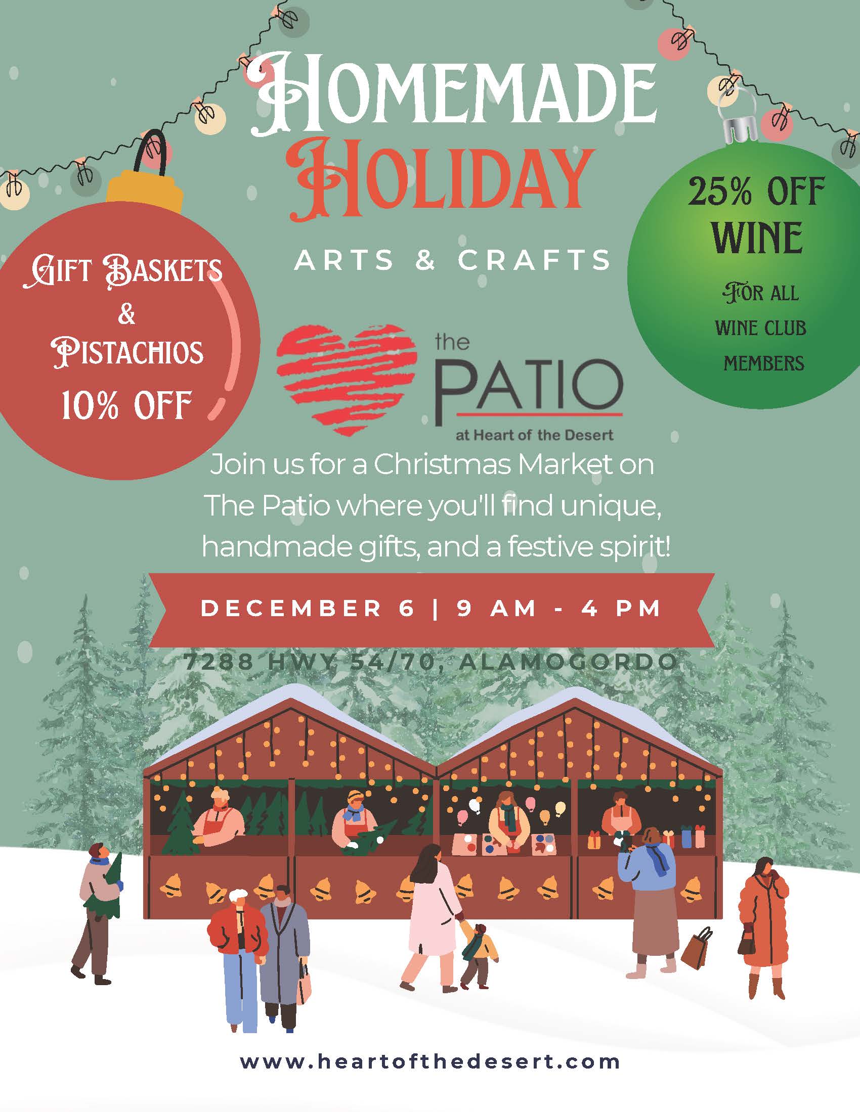 Homemade Holiday, a juried arts and crafts show, will be held Saturday, Dec. 6, 2025, from 9 a.m. – 4 p.m. on The Patio at Heart of the Desert Pistachios and Wine.