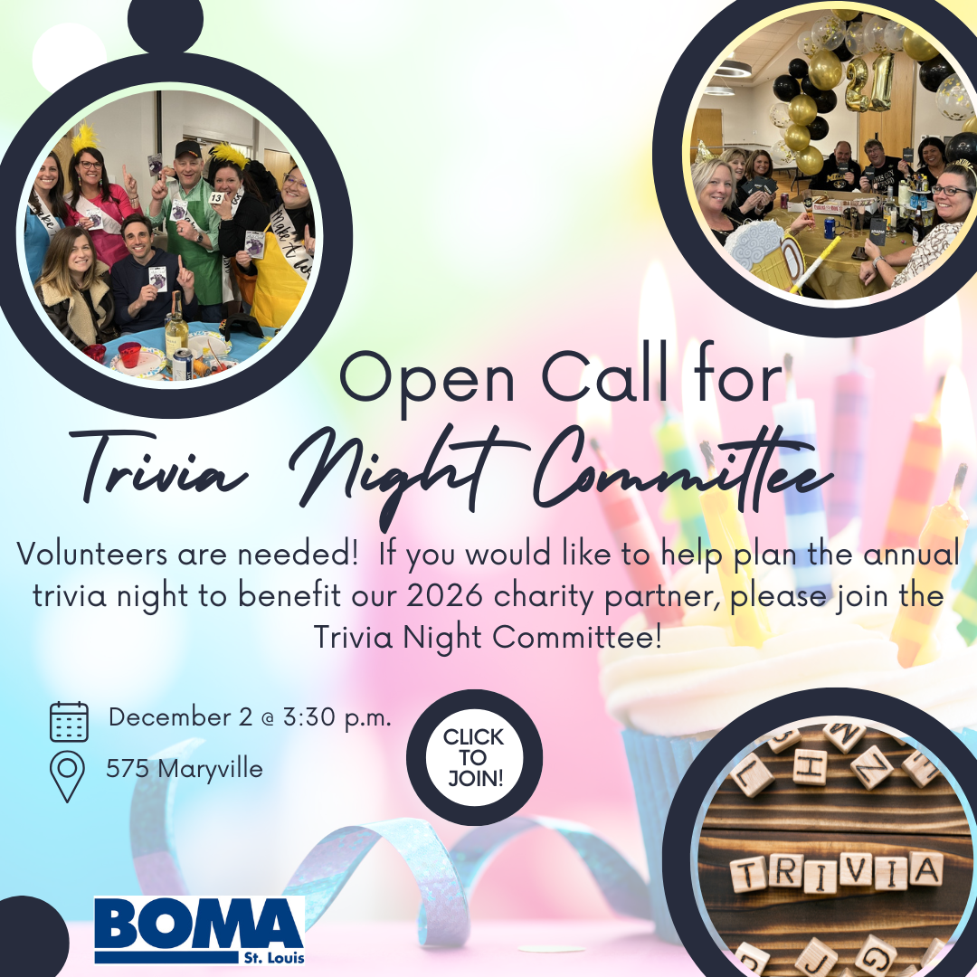 The Trivia Night Committee is starting to plan the 2026 event! Join the committee . . . meet fellow BOMA members and help raise dollars for BOMA's charity partner!