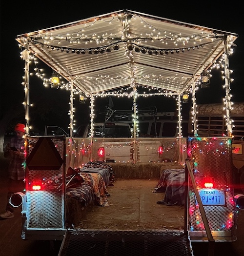We will load everyone up in the vehicle-driven wagon and proceed to the Plaza of Old Mesilla and Mesilla Park to view the holiday lights! We will have sleigh bells and Christmas lights adorned on the wagon, and you will be sitting on hay bales!