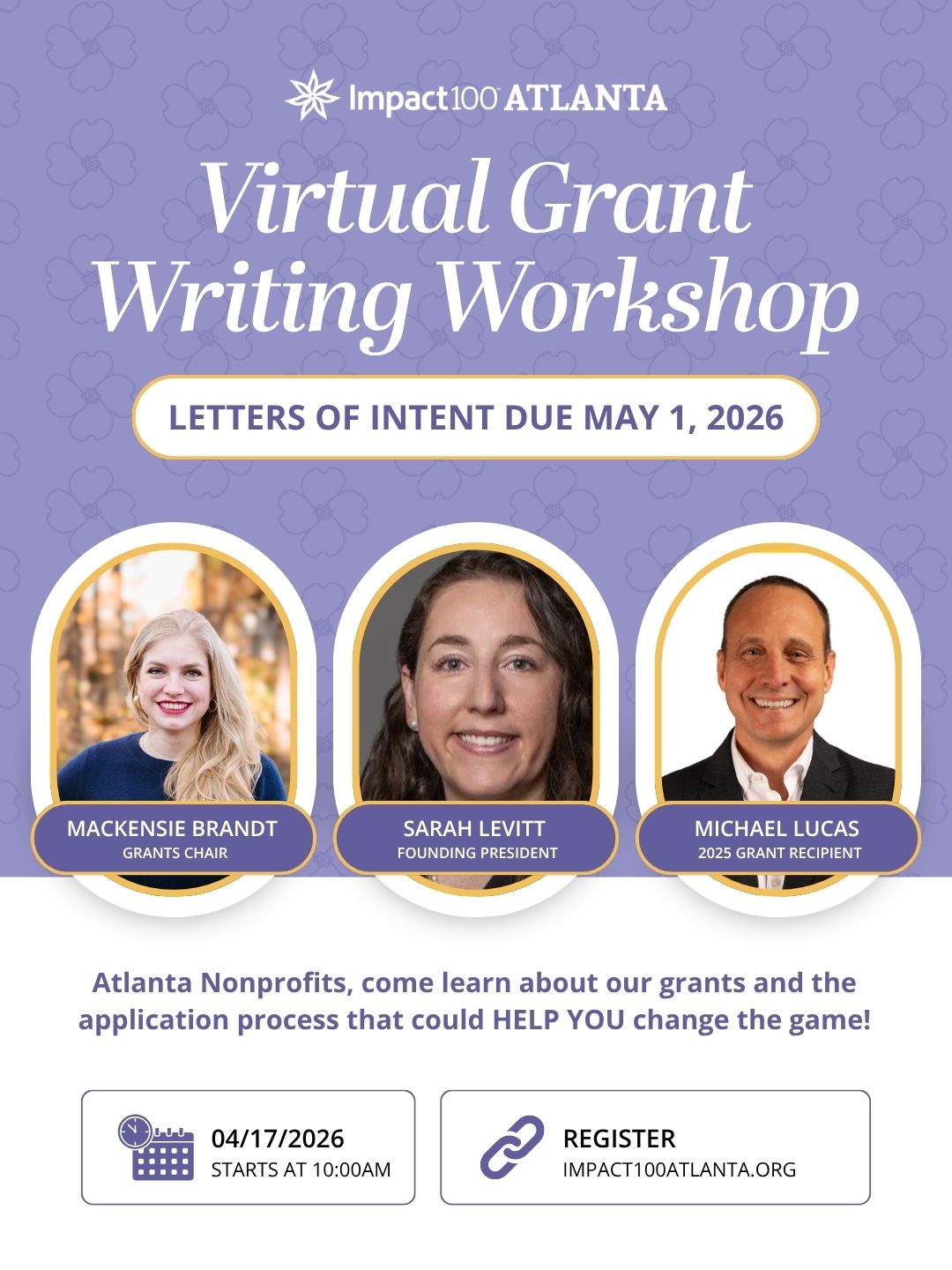 This Grant Writing Workshop is open to any nonprofits who may be interested in learning about the upcoming Impact100 Atlanta 2026 funding opportunities. Impact100 Atlanta will be awarding grants to support transformative and high impact projects serving the local community. Funding amounts to be announced on April 16th at our Big Reveal event.