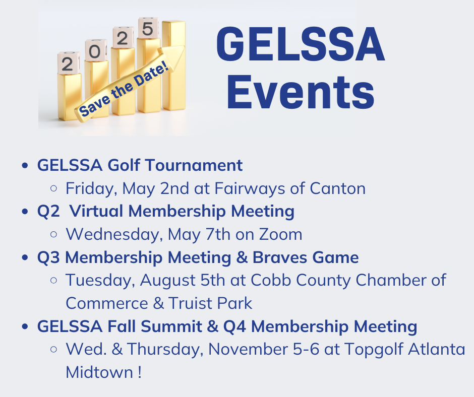 Additionally, mark your calendars for our Virtual Q2 Membership Meeting on May 7th at 12pm. It promises to be another informative session where we'll discuss key industry trends and association updates. We recognize that many of our events are held around the Atlanta Metro area, so we want to ensure that our members in other areas of the State have an opportunity to engage with GELSSA and one another in an easy, online format at least once a year!