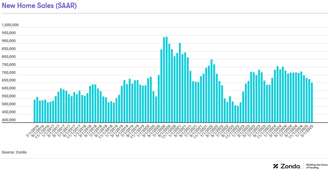 "As market analysts, we monitor both concrete and objective 'hard data' and more nuanced 'soft data' that reflects feelings and perceptions. March marked a turning point for the soft data as economic uncertainty began to weigh on consumers, businesses, and investors. This downshift in sentiment was also evident in Zonda’s builder survey, which focuses on the new home market. In March 2024, 5% of homebuilders told Zonda that 'demand is slower and causing concern.' Those responses jumped to nearly 40% this year. This matched with our actual data on the new home market, which showed sales remained relatively flat month-over-month and are down year-over-year.