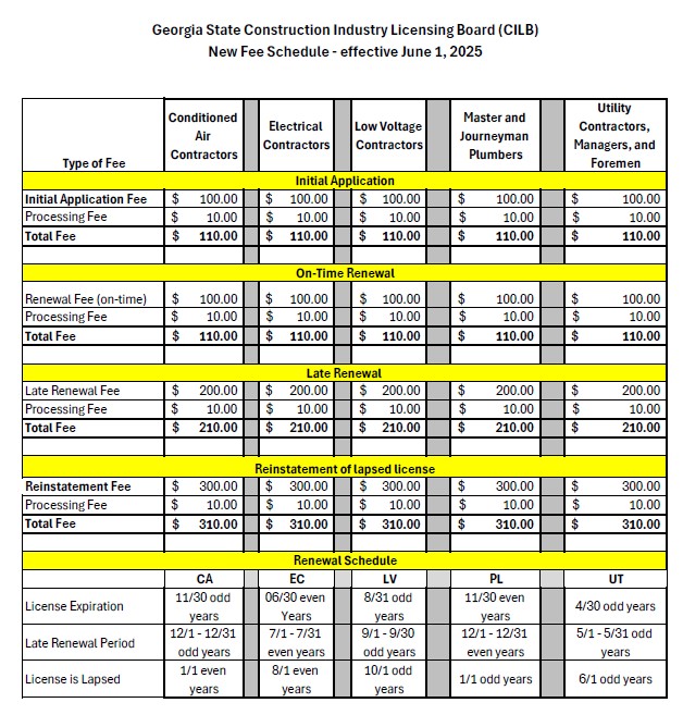 | The Georgia State CILB has released the new fee schedule that will take effect on June 1st. Please view the document for details. |