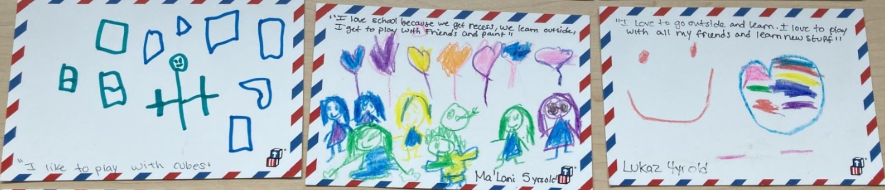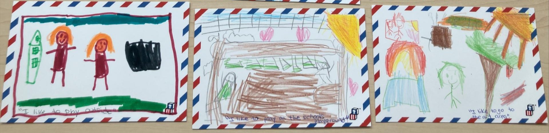 The Academy Global of Citizeneship Head Start program in Chicago drew pictures and wrote what they like to do at their Head Start program: (l to r) "I like to play outside", "I like to play on the school playground", and "I like to go to the art area." |