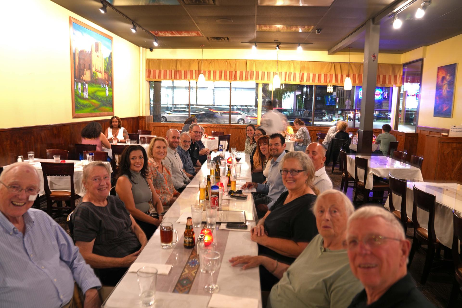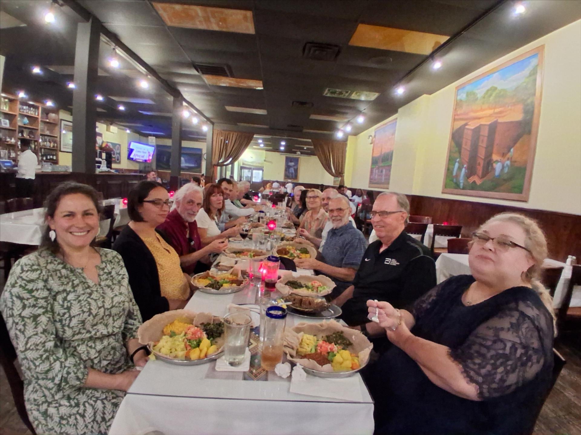 An unplanned tour highlight (?) occurred when a (false) fire alarm was triggered at the school, requiring evacuation of the facility while the building was checked by Fire Department personnel. As soon as the “all clear” signal was given, the tour resumed. At the conclusion, participants proceeded to the nearby Ethiopian Diamond Restaurant, known for authentic Ethiopian cuisine served in a vibrant atmosphere. We were pleased that Malini Suchak, PhD, who was named the new Dean of the SES following the retirement of Dr. Tuchman, was able to join us for the post-tour dinner.