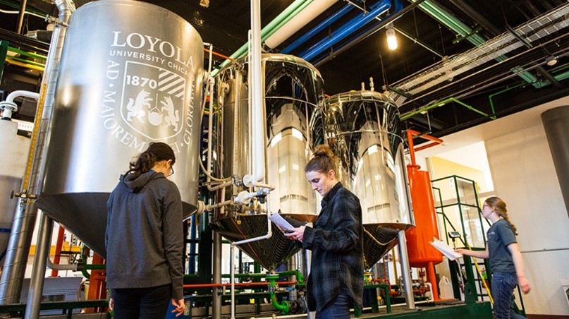 A second tour highlight was the Searle Biodiesel Lab in the SES building, which is home to Loyola’s award-winning biodiesel program. In the biodiesel laboratory, students operate a self-sustaining business converting used cooking oil from cafeteria deep fat fryers into clean-burning biodiesel fuel (and other by-products) to sell to the school’s shuttle bus company, which takes students between the Lakeshore campus and the downtown Water Tower campus.