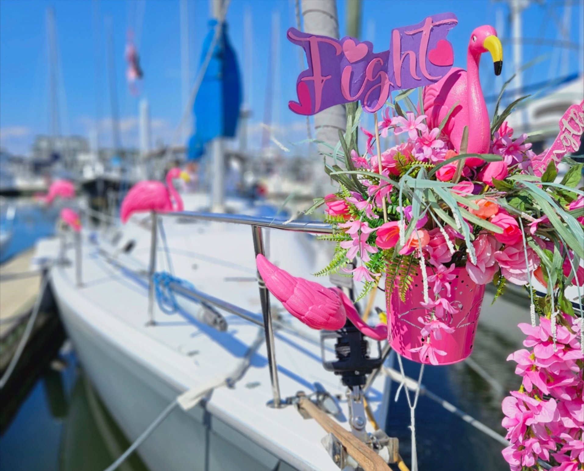 Well, it’s not quite fall here since the highs are in the 90s, but I’m sure some of you farther north are feeling the changing of the seasons. Wherever you are, it’s a great time to get out on the water. Locally, we just wrapped up our Pink Ribbon Regatta “fun”draiser, where sailors could buy seconds to add to their handicap rating—or earn them by wearing costumes, flying certain undergarments from the shrouds, and even grilling while racing. Proceeds went to a local nonprofit that helps uninsured and underinsured women access the breast health support they need.
