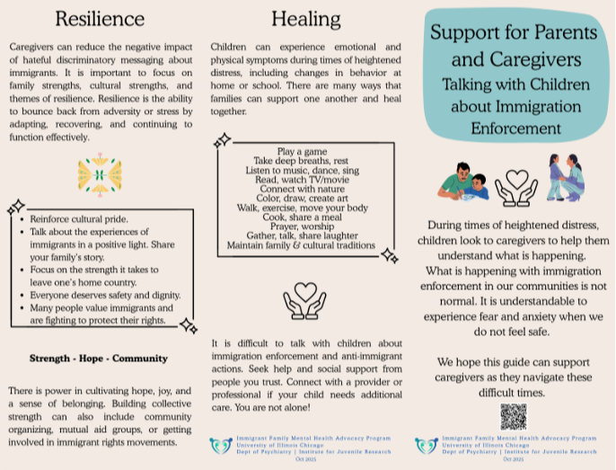 Co-developed by the Immigrant Family Mental Health Advocacy (IFMHA) Program team at the University of Illinois Chicago, Department of Psychiatry, Institute for Juvenile Research: Dana Rusch, Ph.D. (Director of the IFMHA Program), Laura Gonzalez (Undergraduate Applied Psychology Intern), Alondra Maltos Garcia (Undergraduate Applied Psychology Intern), Priscilla Cortez, B.A. (IFMHA Program Coordinator), Kellyn Blaisdell, M.S. (Predoctoral Psychology Intern).