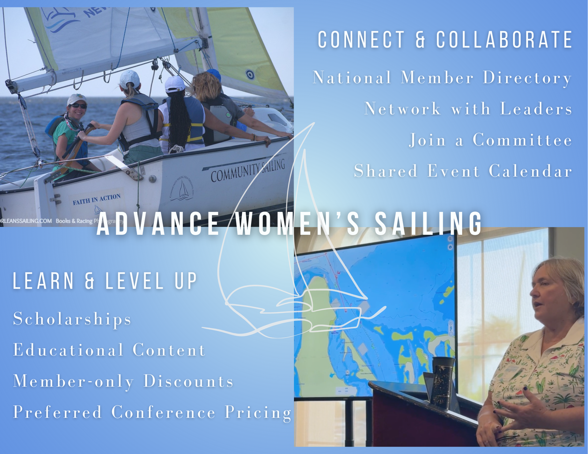 The Leadership Development Community held its inaugural virtual meeting on December 10. This members-only group brings together women who are in, or preparing for, leadership roles within sailing organizations. If that sounds like a good fit for you, you can join the community through the website and receive updates directly.