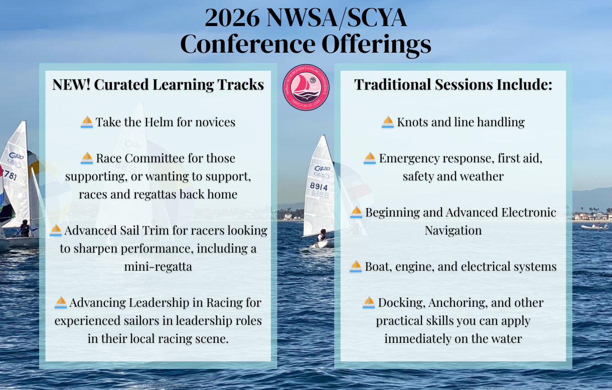 Happy New Year! As you begin planning your 2026 calendars, be sure to mark the dates for our NWSA/SCYA Women’s Sailing Conference, March 20–22 in Long Beach, CA. Early registration ends January 15. Attendance is capped, and several classes have very limited space. NWSA members receive a discount equal to a one-year membership, so be sure to join and log in as a member before registering. We are still seeking conference sponsors, including donations of silent auction items for our AdventureSail fundraiser. Please consider contributing if you can!