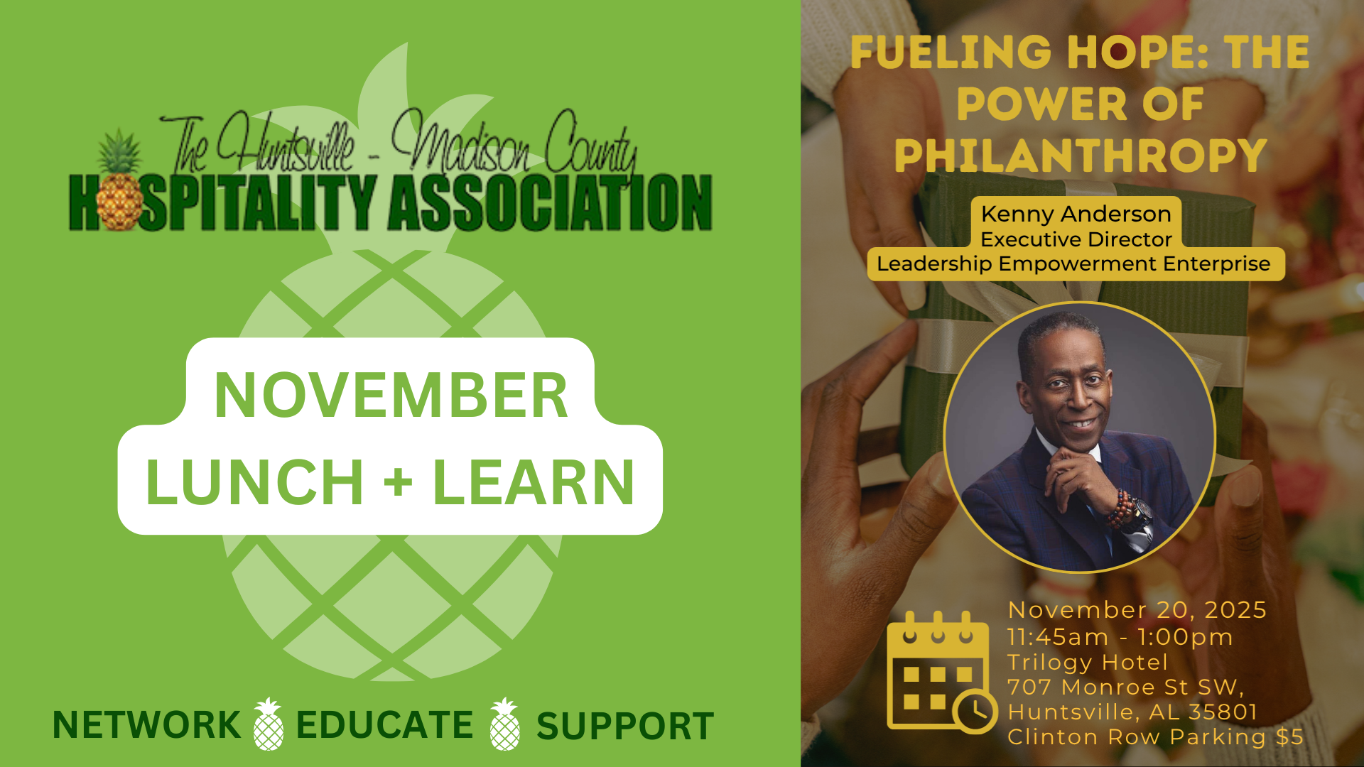 The Huntsville/Madison County Hospitality Association invites members and guests to its November Lunch & Learn, featuring Kenny Anderson, Executive Director of the Leadership Empowerment Enterprise. Join us for an inspiring session titled “Fueling Hope: The Power of Philanthropy,” where Mr. Anderson will explore how generosity and community engagement can transform both individuals and organizations.