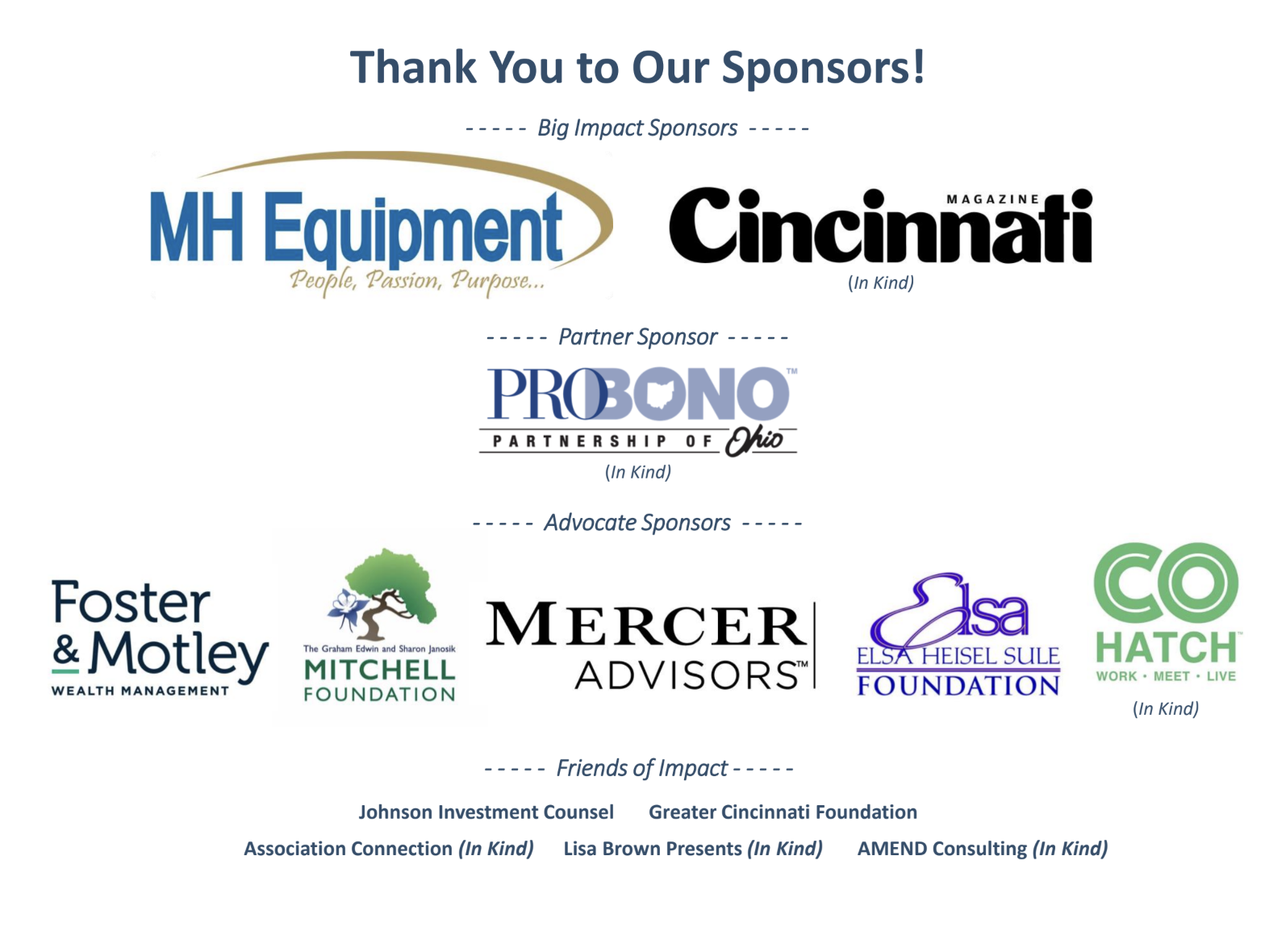 Non-solicitation: Impact 100 Cincinnati provides a safe-haven environment. Members, nonprofit partners, and guests agree not to market or solicit at Impact 100 Cincinnati events. Names, addresses, and contract information are strictly confidential and are used only for communications from Impact 100 Cincinnati