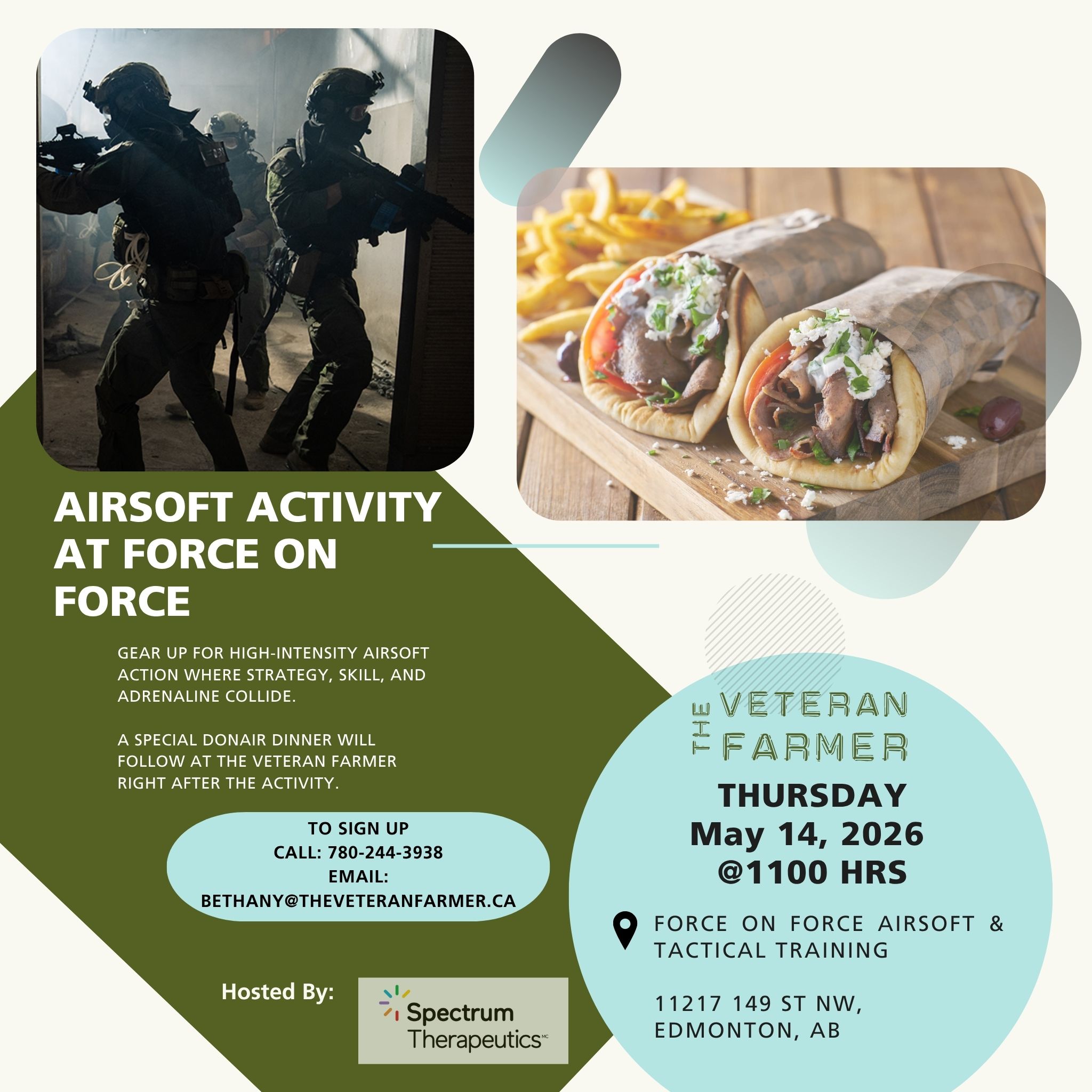 🔥 Come join us at FORCE ON FORCE Airsoft & Tactical Training for an afternoon of high energy tactical training. A donair dinner will follow at TVF 🔥
